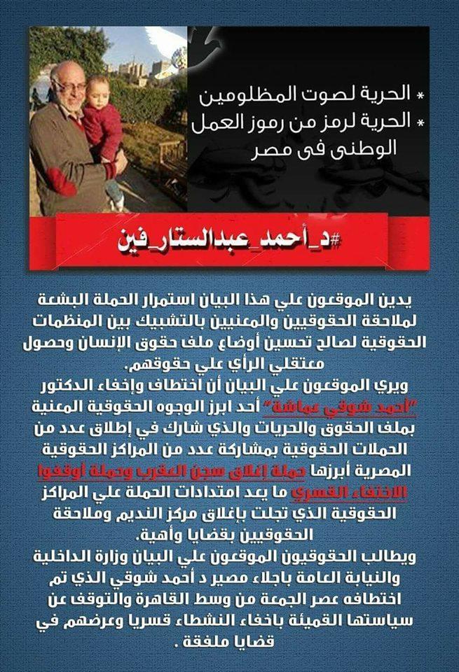 إنه صديقي العزيز الجميل واسمه أحمد عبدالستار “عماشة”، أحد أركان لجنة ضمير مصر صوت المظلومين التي أتشرف برئاستها.. حقوقي بارز ومتواصل مع كل التيارات السياسية ببلادي، أراه بمثابة “سد عالي” في مواجهة التطرف والتشدد، وأبعد ما يكون عن العنف والإرهاب، بل نموذج جميل لإسلامنا الجميل! والمؤسف أن مباحث أمن الدولة قامت باختطاف هذا الرجل الرائع من الشارع يوم الجمعة 10 مارس.. يعني منذ أكثر من عشرة أيام، ولا أحد يعرف مصيره حتى الآن!! وبالتأكيد فهو في مقرات أمن الدولة السرية ويتعرض لتعذيب بشع! والهدف تلفيق قضية له هو منها بريء! وكم من القضايا ملفقة للأبرياء ببلادي في ظل حكم العسكر الجاثم على أنفاسنا!