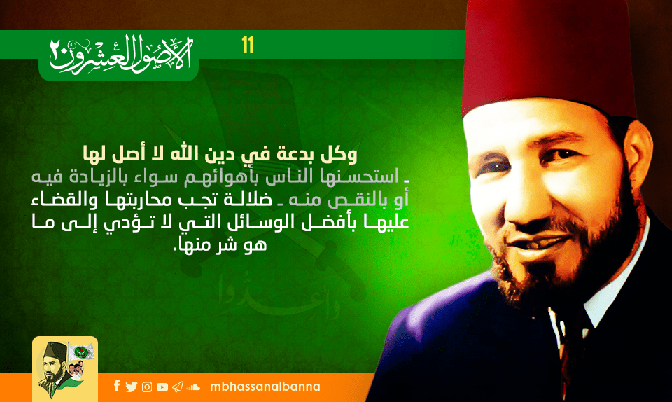 11)وكل بدعة في دين الله لا أصل لها ـ استحسنها الناس بأهوائهم سواء بالزيادة فيه أو بالنقص منه ـ ضلالة تجب محاربتها والقضاء عليها بأفضل الوسائل التي لا تؤدي إلى ما هو شر منها.