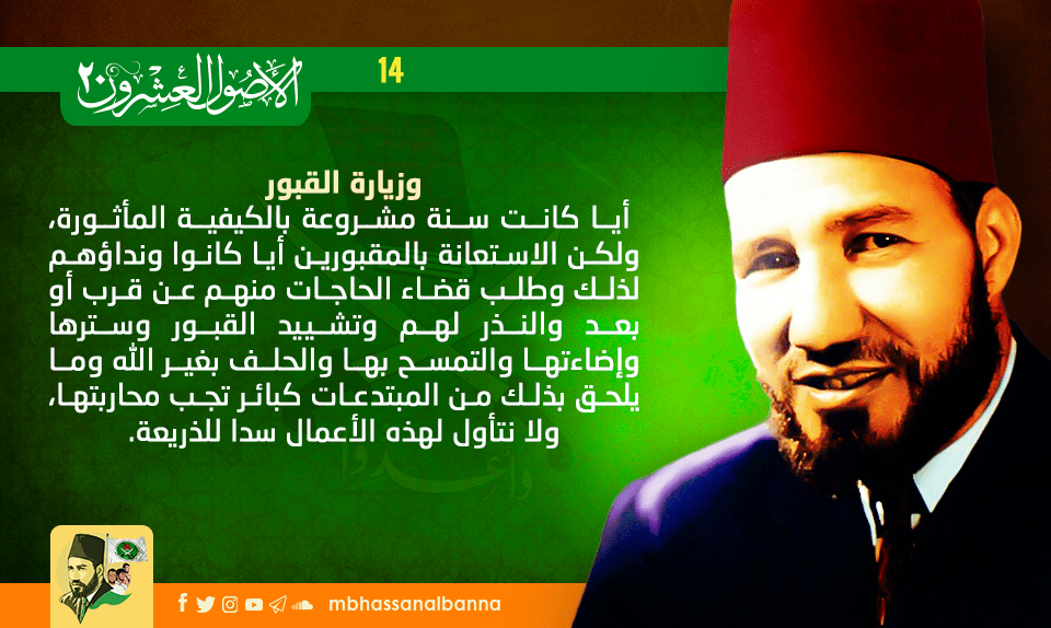 14) وزيارة القبور أيا كانت سنة مشروعة بالكيفية المأثورة، ولكن الاستعانة بالمقبورين أيا كانوا ونداؤهم لذلك وطلب قضاء الحاجات منهم عن قرب أو بعد والنذر لهم وتشييد القبور وسترها وإضاءتها والتمسح بها والحلف بغير الله وما يلحق بذلك من المبتدعات كبائر تجب محاربتها، ولا نتأول لهذه الأعمال سدا للذريعة.