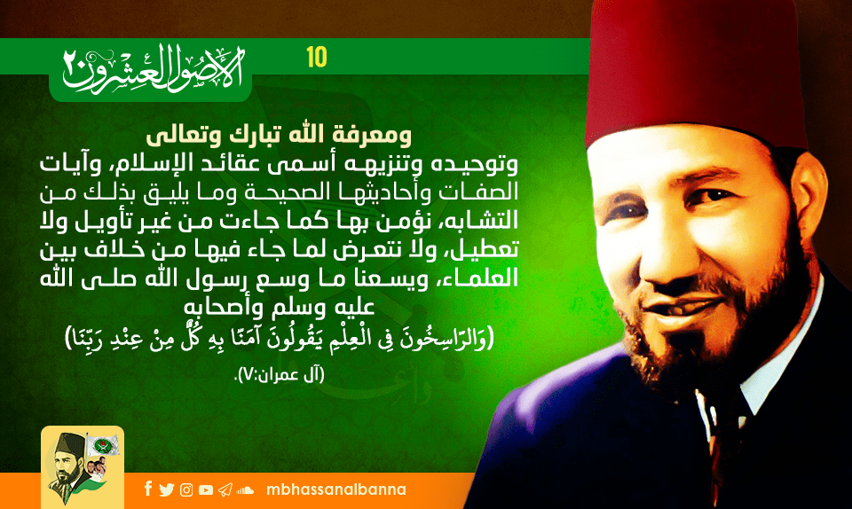 10)ومعرفة الله تبارك وتعالى وتوحيده وتنزيهه أسمى عقائد الإسلام، وآيات الصفات وأحاديثها الصحيحة وما يليق بذلك من التشابه، نؤمن بها كما جاءت من غير تأويل ولا تعطيل، ولا نتعرض لما جاء فيها من خلاف بين العلماء، ويسعنا ما وسع رسول الله صلى الله عليه وسلم وأصحابه (وَالرَّاسِخُونَ فِي الْعِلْمِ يَقُولُونَ آمَنَّا بِهِ كُلٌّ مِنْ عِنْدِ رَبِّنَا) (آل عمران:7).