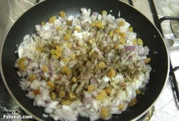 علي النار شويه زيت في الطاسه وبنضيف البصل والبهارات ونقلب البصل لحد ما يدبل لكن مش لدرجه يستوي
