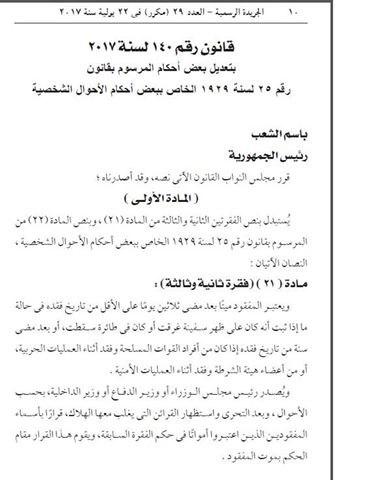 ثم اقرار قانون اعتبار المفقود ميتا بعد 30يوم