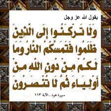 يقول الله تعالى في سورة هود: “وَلَا تَرْكَنُوا إِلَى الَّذِينَ ظَلَمُوا فَتَمَسَّكُمُ النَّارُ وَمَا لَكُمْ مِنْ دُونِ اللَّهِ مِنْ أَوْلِيَاءَ ثُمَّ لَا تُنْصَرُونَ (113)”، هذه الآية الحكيمة التي يصفها الإمام أبو السعود: “أبلغُ ما يُتصور في النّهي عن الظلم والتهديدِ عليه.”، ويقول الإمام الآلوسي في هذه الآية: “ذهب أكثر المفسرين، قالوا: وإذا كان حال الميل في الجملة إلى من وجد منه ظلم ما في الإفضاء إلى مساس النّاس النّار فما ظنّك بمن يميل إلى الراسخين في الظلم كل الميل.” والحقّ يُقال أنّ هذه الآية لَتستوقف كلَّ ذي لُبّ وتنبّه الحسّ في وقفة مع تلك الفئة من النّاس التي تُعمّر بنيان الاستبداد وتسترضي الظلم ولا تنفر منه، و تتواجد في مختلف الفئات الاجتماعية باختلاف مستواها العلميّ أو ميلها الفكريّ وهي (فئة الراكنين إلى الظلمة)، وفي الآية السابقة نتأمّل في خمس وقفات.