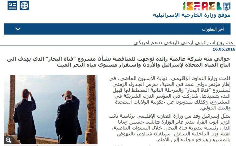 وفي مايو الماضى قال موقع وزارة الخارجية الإسرائيلية باللغة العربية أن وزارة التعاون الإقليمي بالكيان الصهيونى قامت في إطار مؤتمر دولي عقد في العقبة، بعرض الجدول الزمني لمشروع ” قناة البحار ” والمرحلة الثانية المخطط لها قبيل البدء بتنفيذها .