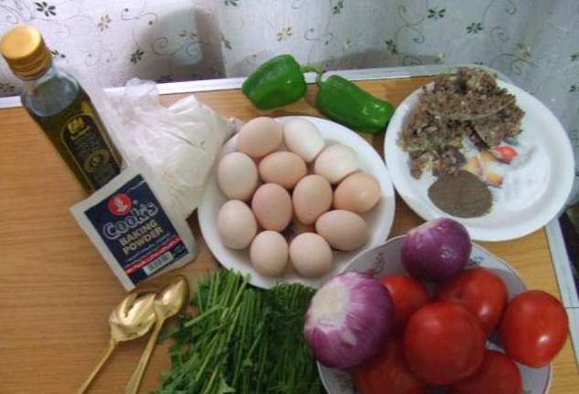 بعد ما قلبنا البيض والبصل والخضره والملح والفلفل والكمون والبيكنج بودر