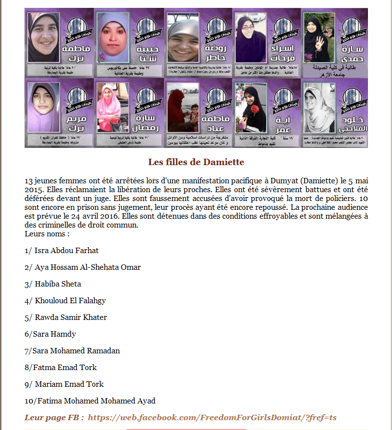 نشر موقع فرنسي تقريراً مصغرا عن قضية بنات دمياط موضحاص الانتهاكات اللاتي يتعرضن لها و معاناة أمهاتهن و مؤكداً أن النظام الحالي يعادي كل من يتجرأ على الاحتجاج حتى على الفيسبوك