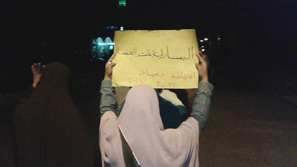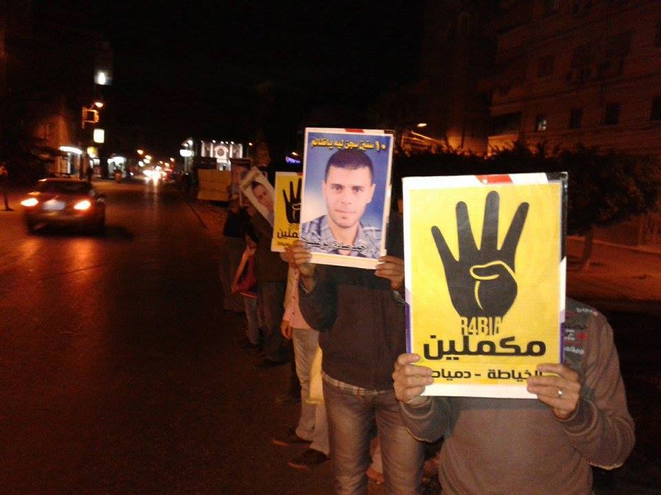 نظم ثوار قرية الخياطة منذ قليل سلسلة بشرية على الطريق الواصل بين مدنيتي #دمياط وعزبة البرج رافعين لافتات لدعم صمود البصارطة وأعلام #مصر وشارات #رابعة وصورالشهداء والمعتقلين ومن أبناء القرية .