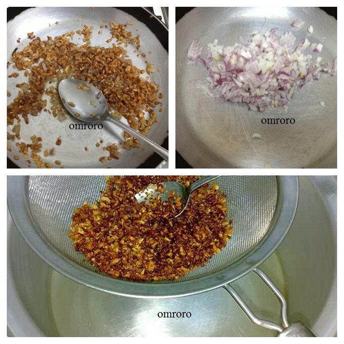 3- في قدر على النار، يوضع كمية من الزيت ويقلى البصل فيها حتى يصبح ذهبي ثم يرفع البصل من الزيت جانباً.