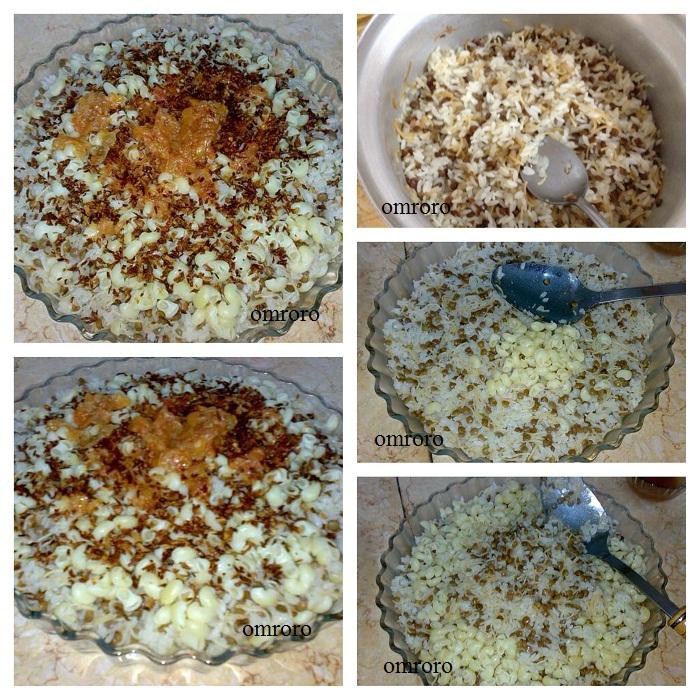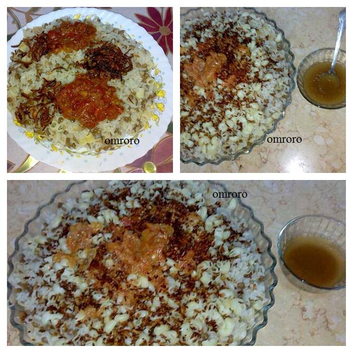 6- عند تقديم الكشري، يوضع الأرز والعدس ثم المكرونة ويزيين بصلصة الطماطم والبصل المحمر والدقة.