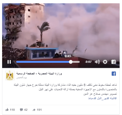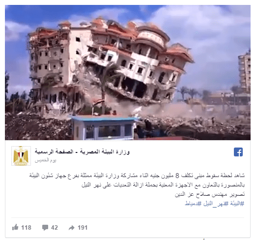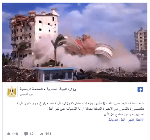 أن :” وزارة البيئة باستخدام أساليب بدائية لهدم مبنى على حرم نيل مصر تقدر تكلفة بنائه 8 ملايين جنيه مصري (حوالي 800 ألف دولار)، بحسب الصفحة الرسمية لوزارة البيئة، إلا أن المبنى المذكور سقط بصورة مفاجئة فوق معدات الوزارة وسط هروب الحضور.”