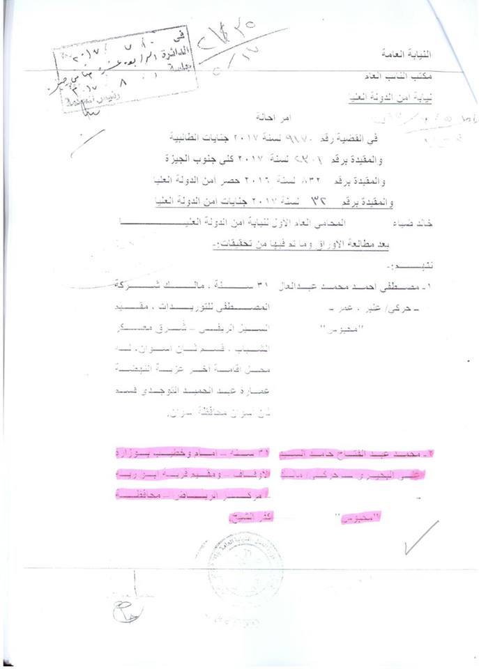 وبحسب المستندات التي وردت للمنظمة، فقد اعترف أحد المتهمين في القضية رقم 9170 لسنة 2017 جنايات الطلبية، والمقيدة برقم 2301 لسنة 2017 كلي جنوب الجيزة والمقيدة برقم 32 لسنة 2017 جنايات أمن الدولة العليا، أن شخص يدعى “مدحت” هارب، أخبره أنه من ارتكب تفجير ستاد كفرالشيخ.