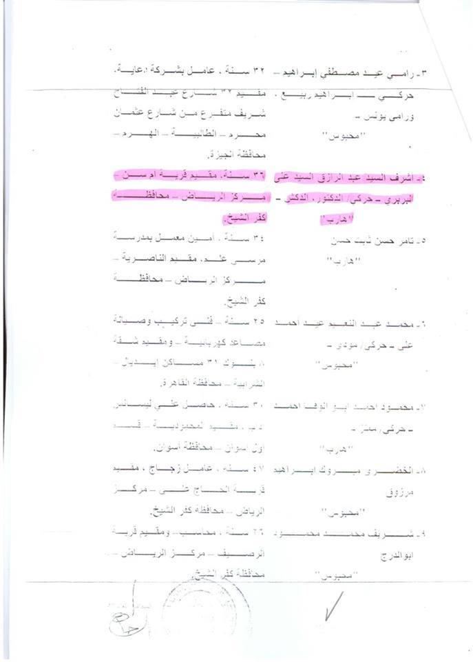 وأضاف محمد البحيري في اعترافاته، ودي كانت المرة الوحيدة اللي شفت فيها “مدحت”، لكن المتهم (الهارب) أشرف السيد عبدالرازق السيد علي البريري، 36 عامًا، مقيم قرية أم السن – مركز الرياض – محافظة كفرالشيخ، فضل يتواصل مع “مدحت” بعد كده وقابله مرتين قبل كده في كفرالشيخ، وفي مرة مدحت قال لأشرف أن هو اللي منفذ العملية بتاعة ستاد كفرالشيخ اللي استهدفوا فيها أتوبيس طلبة الكلية الحربية”.