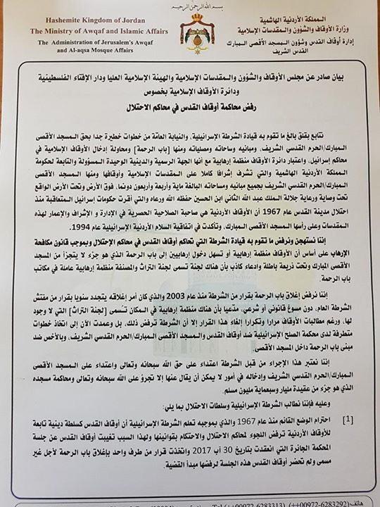 نتابع بقلق بالغ ما تقوم به قيادة الشرطة الإسرائيلية، والنيابة العامّة من خطوات خطيرة جدا بحق الـمسجد الأقصى الـمبارك/الحرم القدسي الشريف، ومبانيه وساحاته ومصلياته ومنها [باب الرحمة] ومحاولة إدخال الأوقاف الإسلامية في محاكم إسرائيل، واعتبار دائرة الأوقاف منظمة إرهابية مع أنها الجهة الرسمية والدينية الوحيدة الـمسؤولة والتابعة لحكومة الـمملكة الأردنية الهاشمية والتي تشرف إشرافا كاملا على الـمقدسات الإسلامية وأوقافها ومنها الـمسجد الأقصى الـمبارك/الحرم القدسي الشريف بجميع مبانيه ومساحاته البالغة ماية وأربعة وأربعون دونما، فوق الأرض وتحت الأرض الواقع تحت وصاية ورعاية جلالة الـملك عبد الله الثاني ابن الحسين حفظه الله ورعاه والتي أقرت حكومات إسرائيل الـمتعاقبة منذ احتلال مدينة القدس عام 1967 أن الأوقاف الأردنية هي صاحبة الصلاحية الحصرية في الإدارة و الإشراف والإعمار لهذه الـمقدسات وعلى رأسها الـمسجد الأقصى الـمبارك، وتأكدت في اتفاقية السلام الأردنية الإسرائيلية عام 1994.