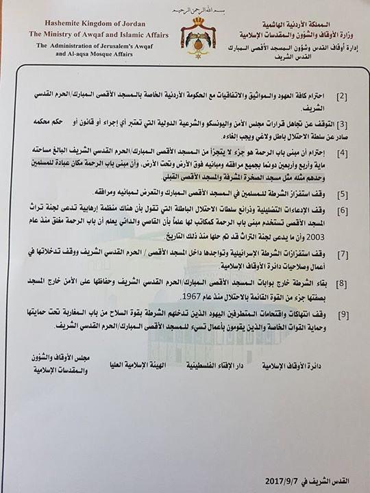 [7] وقف استفزازات الشرطة الإسرائيلية وتواجدها داخل المسجد الأقصى / الحرم القدسي الشريف ووقف تدخلاتها في أعمال وصلاحيات دائرة الأوقاف الإسلامية.