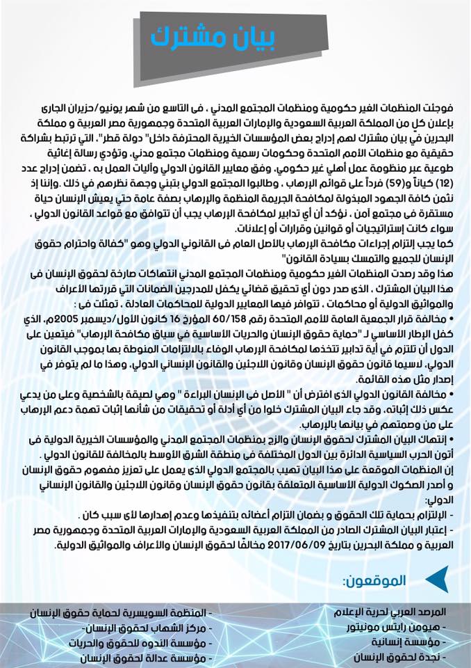 - اعتبار البيان المشترك الصادر من المملكة العربية السعودية والإمارات العربية المتحدة وجمهورية مصر العربية و مملكة البحرين بتاريخ 09/06/2017 مخالفًا لحقوق الإنسان والأعراف والمواثيق الدولية.