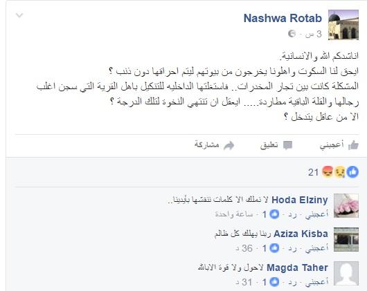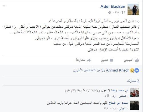 وأضاف أهالي القرية للمنظمة في استغاثتهم أن قوات الأمن التابعة للسلطات المصرية، قامت بإخلاء عدد من منازل ما أسموهم بـ “المطاردين”، وقاموا بإخراج النساء من منازلهم، واحتلت قوات الأمن المنازل، مع استمرار توافد التعزيزات من قوات الأمن، بما جعل الأهالى يصفون ما يحدث بأنه عملية قتل بالبطيء للمواطنين، بعد انتشار الخوف بينهم جراء ما وصفوه بالجرائم التى يتعرضون لها منذ فجر أمس الثلاثاء وحتى اليوم الأربعاء.