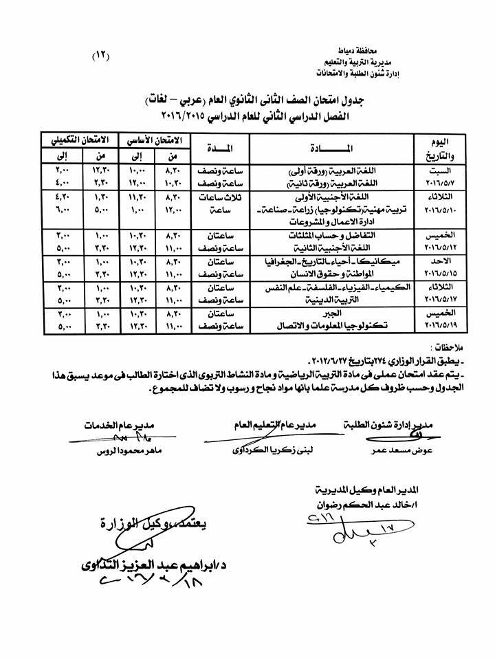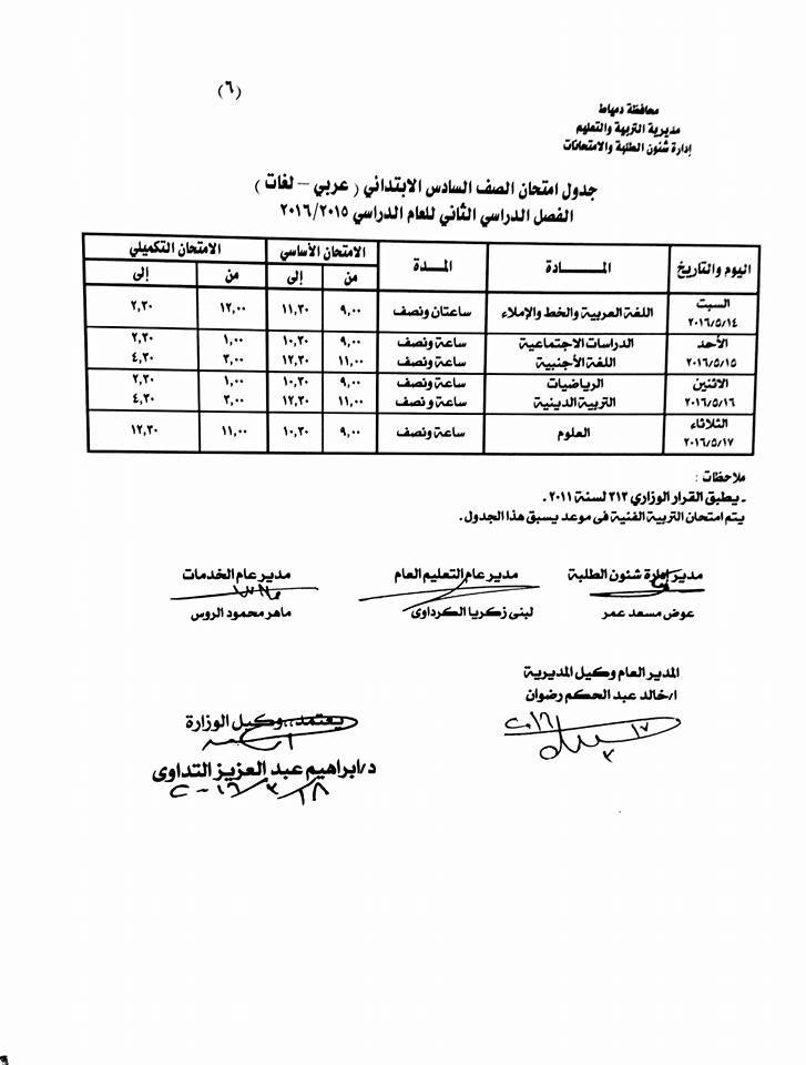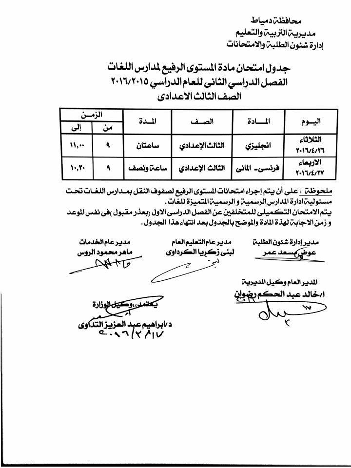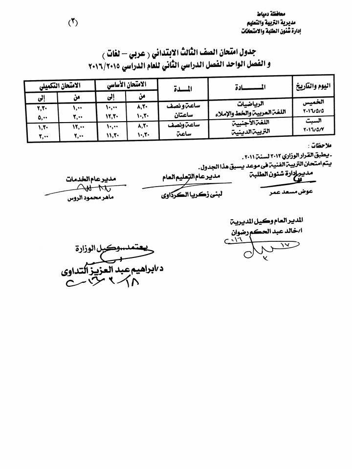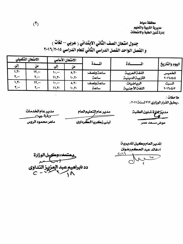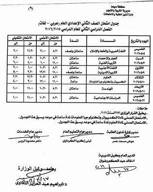 ننشر هنا جداول امتحانات الفصل الدراسي الثاني لكافة المراحل الدراسية عربي / لغات و المستوى الخاص المرحلة الابتدائية : المرحلة الاعدادية المرحلة الثانوية :