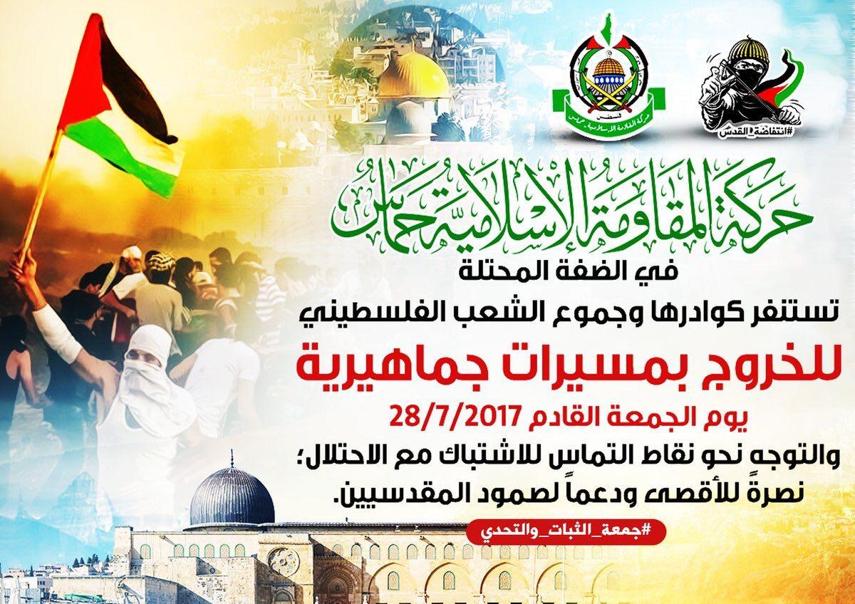 حركة #حماس في الضفة الغربية تستنفر كوادرها وجموع الشعب الفلسطيني للخروج بمسيرات جماهيرية الجمعة القادم والتوجه نجو نقاط التماس مع الاحتلال