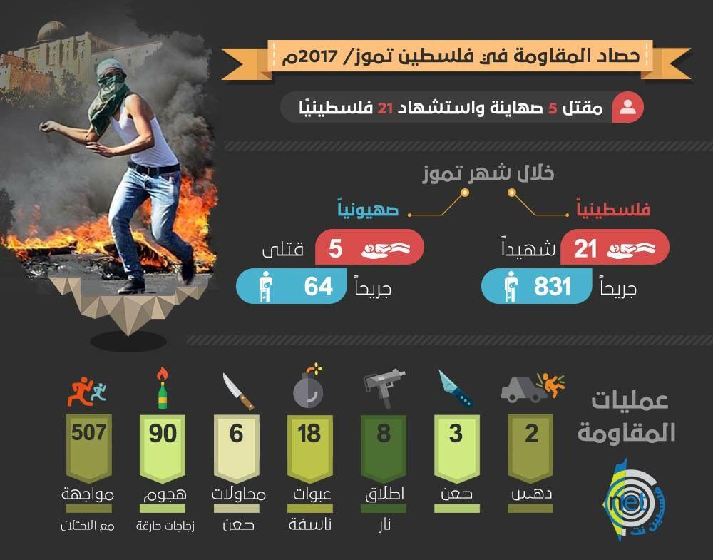 حصاد #انتفاضة_القدس خلال شهر تموز (يوليو) الماضي 21 شهيدا و5 قتلى صهاينة