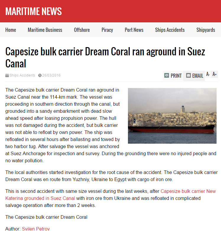شحوط ناقلة صب أخرى في قناة السويس، بعد ثلاث أسابيع من شحوط الناقلة “نيو كاترينا“، في نفس الموقع (حسب مارين ترافيك: الكيلو 63، مدخل التفريعة الجديدة؛ وحسب ماريتيايم نيوز: الكيلو 114، مخرج التفريعة) ، ونفس حجم السفينة،