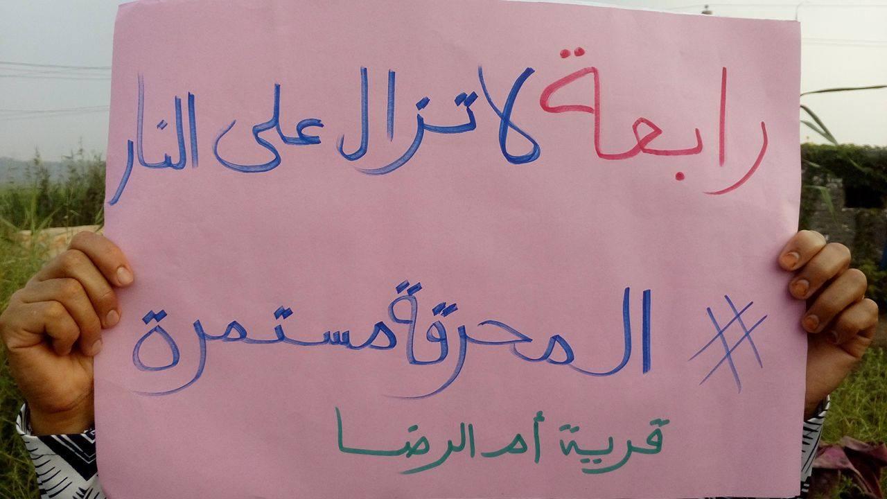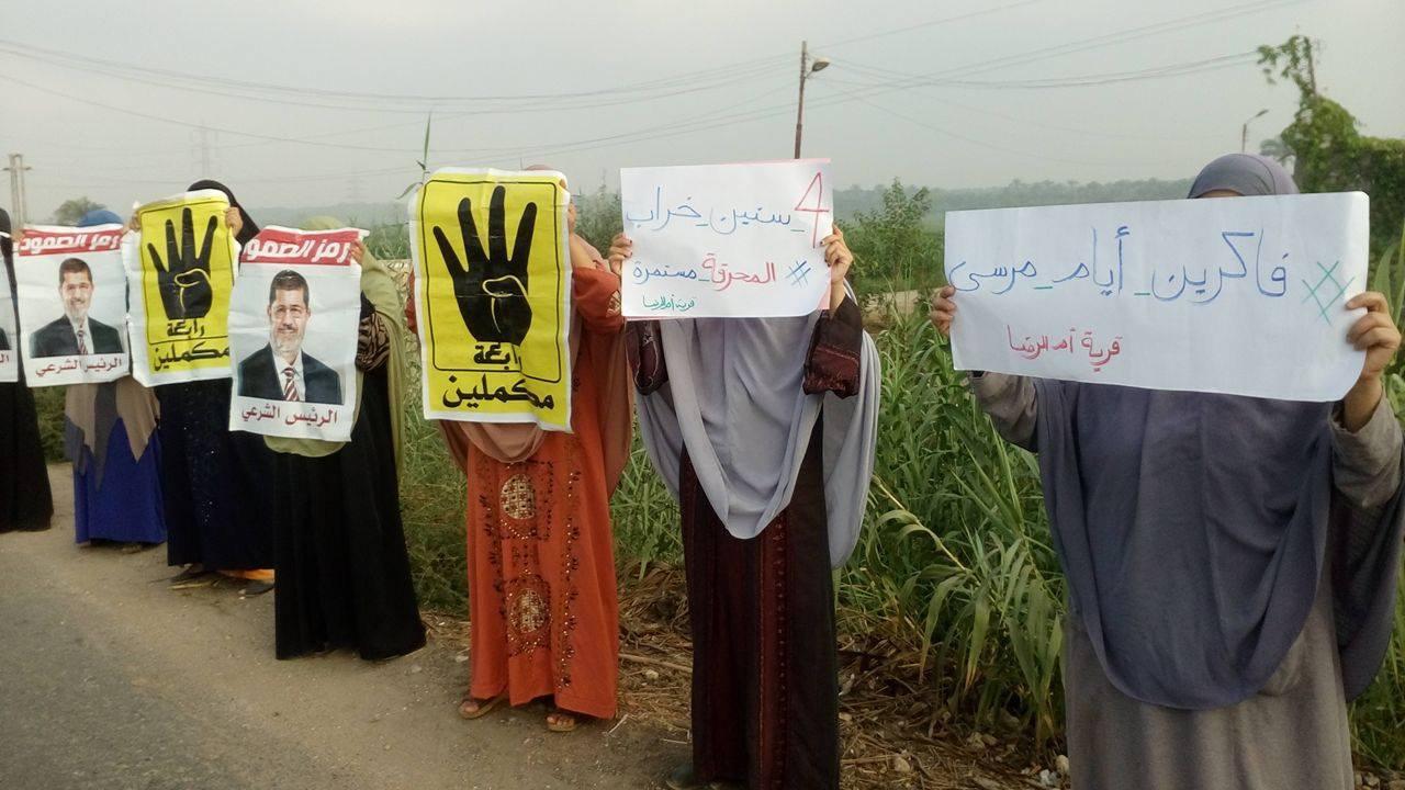 ورفعت المشاركات لافتات تذكر بشهداء مجزرة رابعة العدوية التي قدمت فيها القرية اثنين من أبنائها شهداء