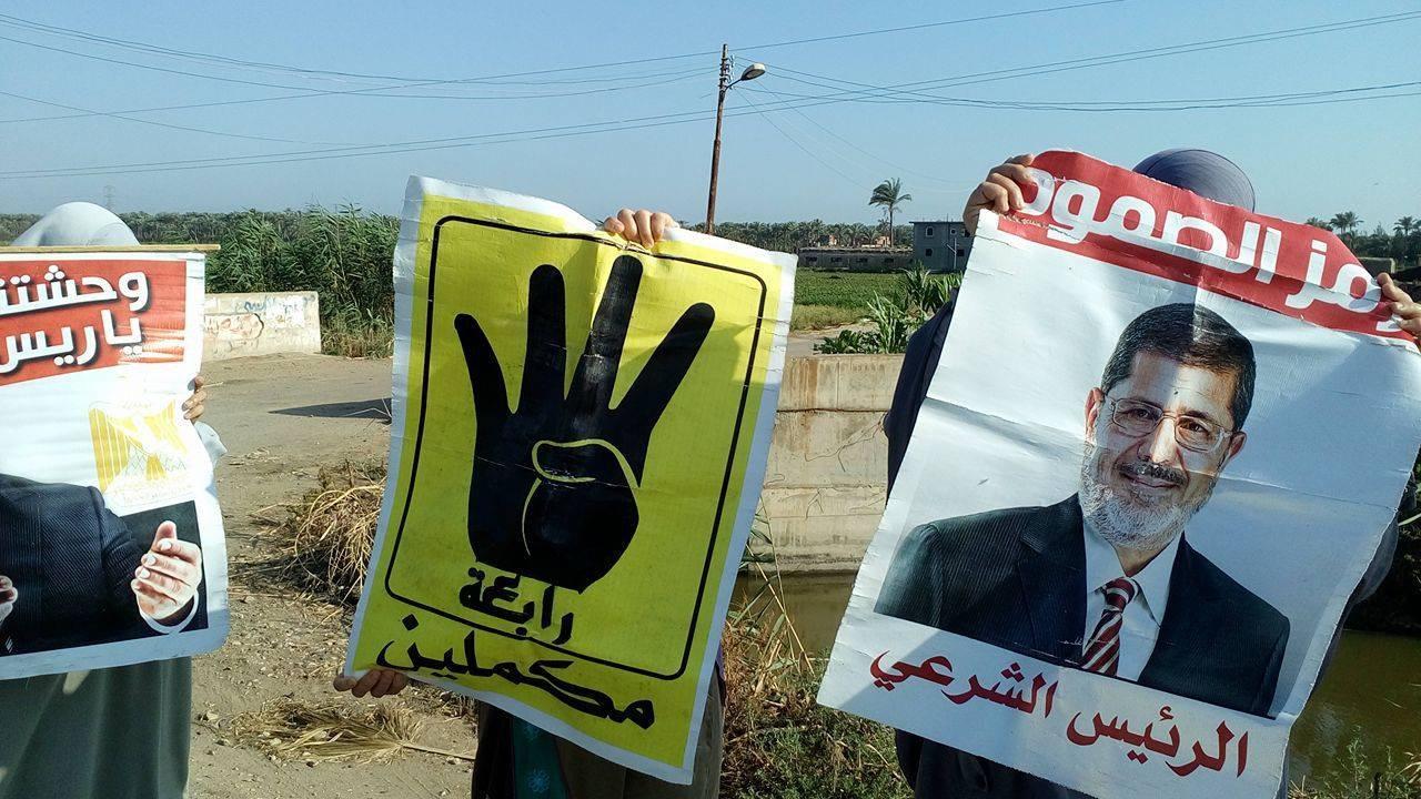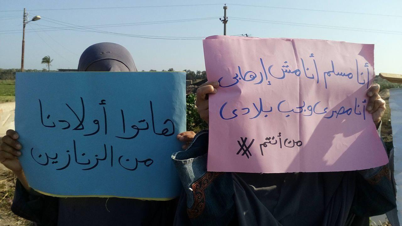 لافتات رفعتها أمهات المعتقلين و الشهداء وزوجاتهم و بناتهم على طريق دمياط – جمصة الزراعي أمام قرية أم الرضا في سلسلة بشرية تؤكد على رفض الانقلاب و ألاعيبه ضد الشعب المصري .