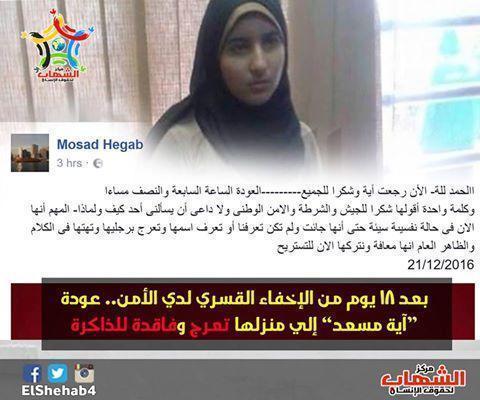 هذا ما قاله والد ايه مسعد بعد عودتها امس في تمام السابعة مساءا بعد اخفاء قسري دام 18 يوما فاقدة للذاكرة والنطق وتعرج .