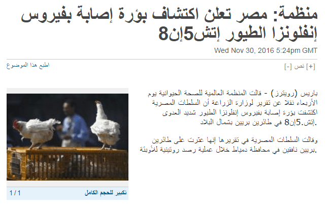أكدت وكالة رويترز نقلاً عن المنظمة العالمية للصحة الحيوانية اليوم الأربعاء نقلا عن تقرير لوزارة الزراعة بحكومة الانقلاب أنها اكتشفت بؤرة إصابة بفيروس إنفلونزا الطيور شديد العدوى إتش.5إن8 في طائرين بريين بدمياط .