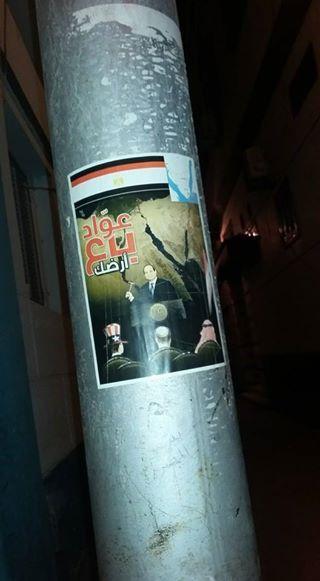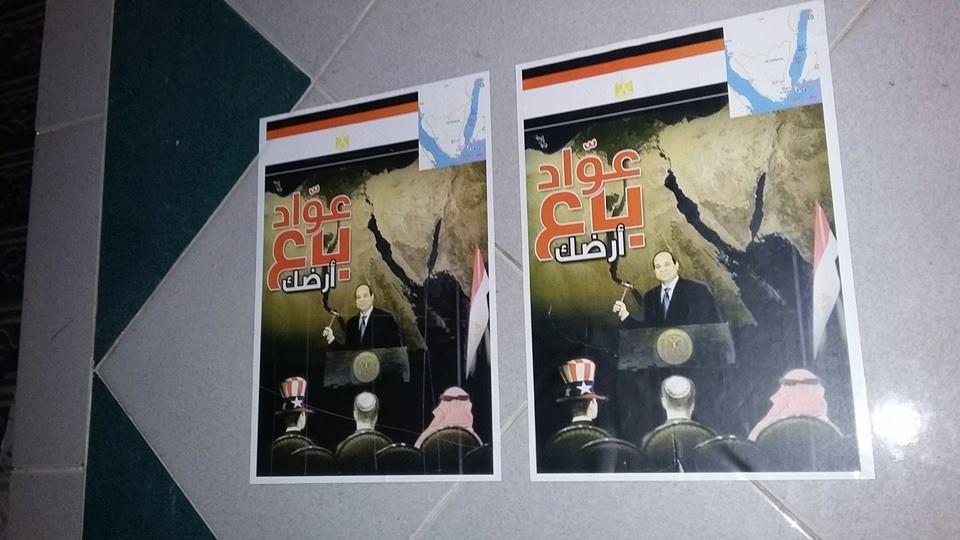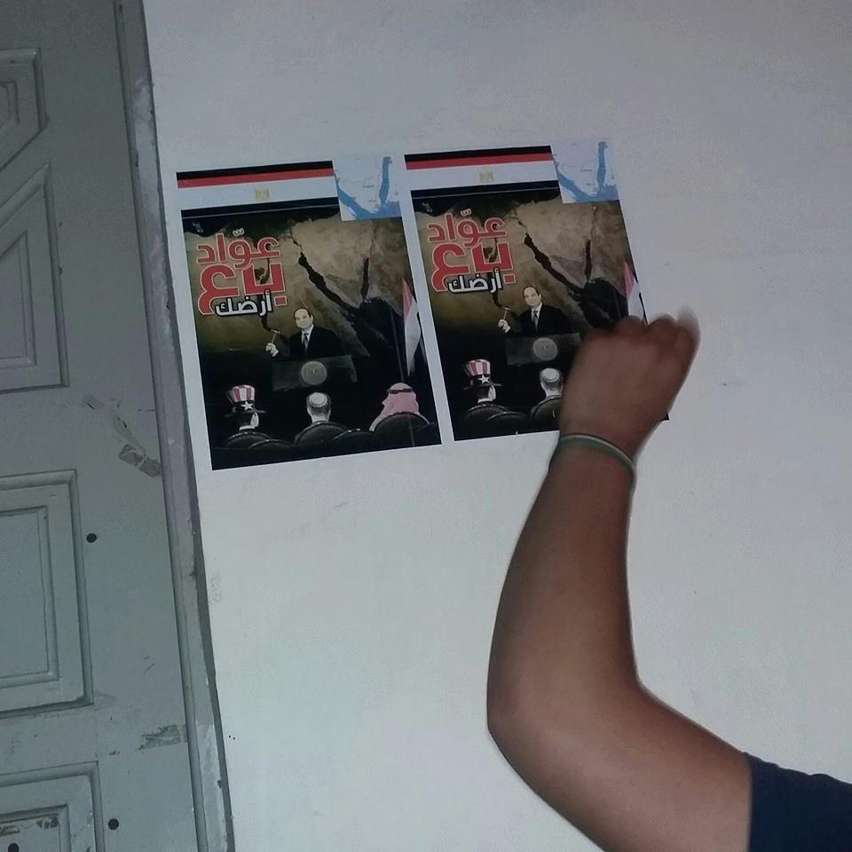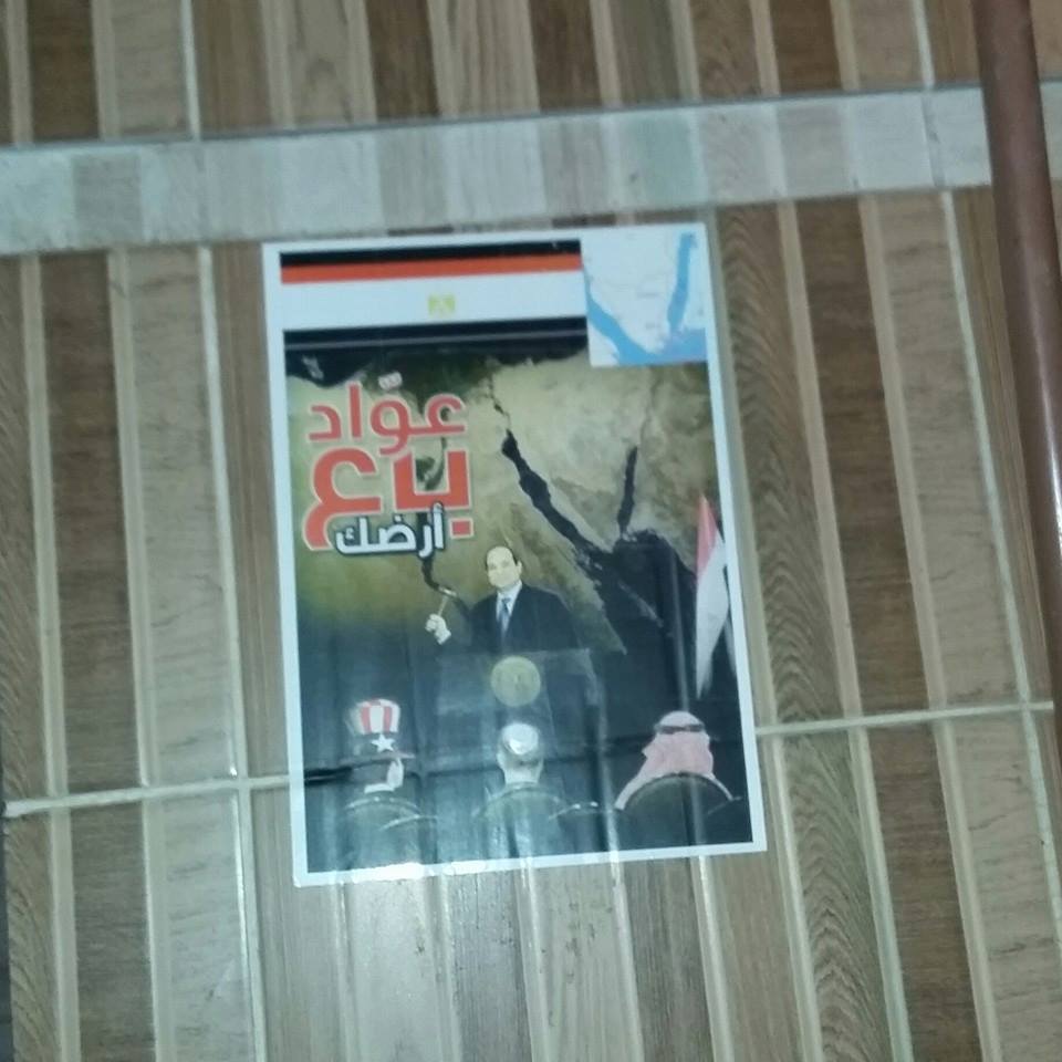 حملت الملصقات عبارات عواد باع ارضك و صور الخائن السيسي و خريطة مصر و دعوات للنزول للثورة ضد بيع مصر يوم 25 أبريل