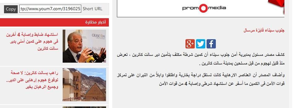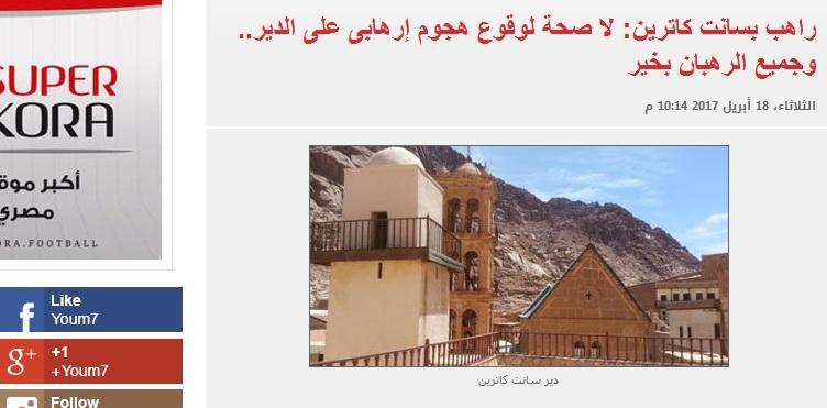 على صعيد اخر اعلن اعلام الانقلاب هجوم ارهابي على وتبادل لاطلاق النار والارهابي يركب متوسيكل وقصة ورواية والشطة والبهارات لاعلام السيس . واتضح اطلاق نار خطأ من القوة الامنية وشهادة احد القاسوسة ان الدير ومن بداخله بخير ولا يوجد هجوم ارهابي ؟؟!!