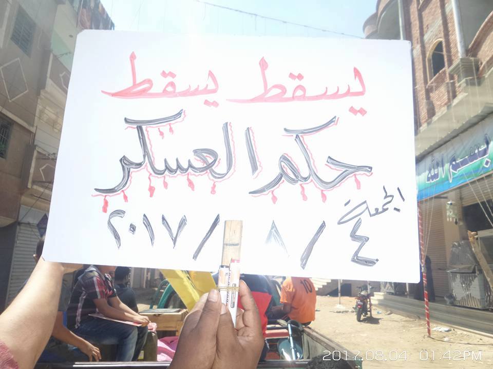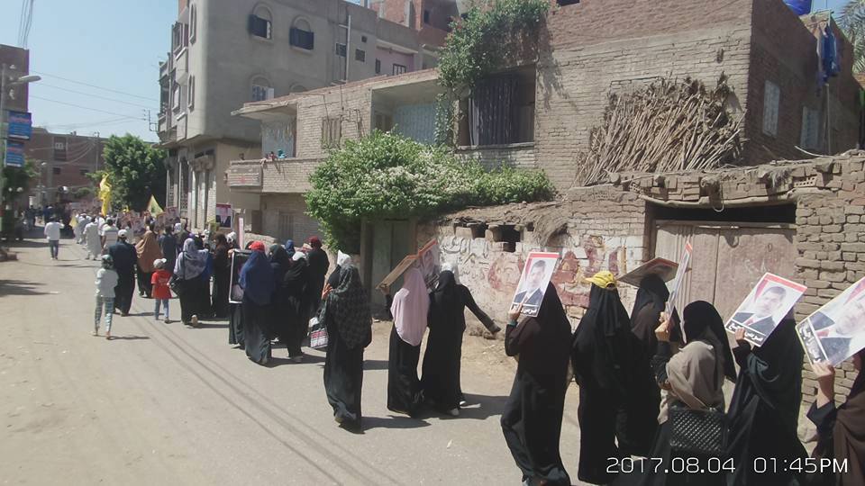وبلافتات يسقط يسقط حكم العسكر بجوار علم مصر وصور الرئيس محمد مرسى وشارات رابعة العدوية وصور الشهداء والمعتقلين، جابت المسيرة الشوارع والأحياء وسط تعالى الهتافات المنددة بتصاعد جرائم الانقلاب من اعتقال تعسفى وإخفاء قسرى وقتل عبر الاهمال الطبى بالبطى داخل المعتقلات لمناهضى الانقلاب.