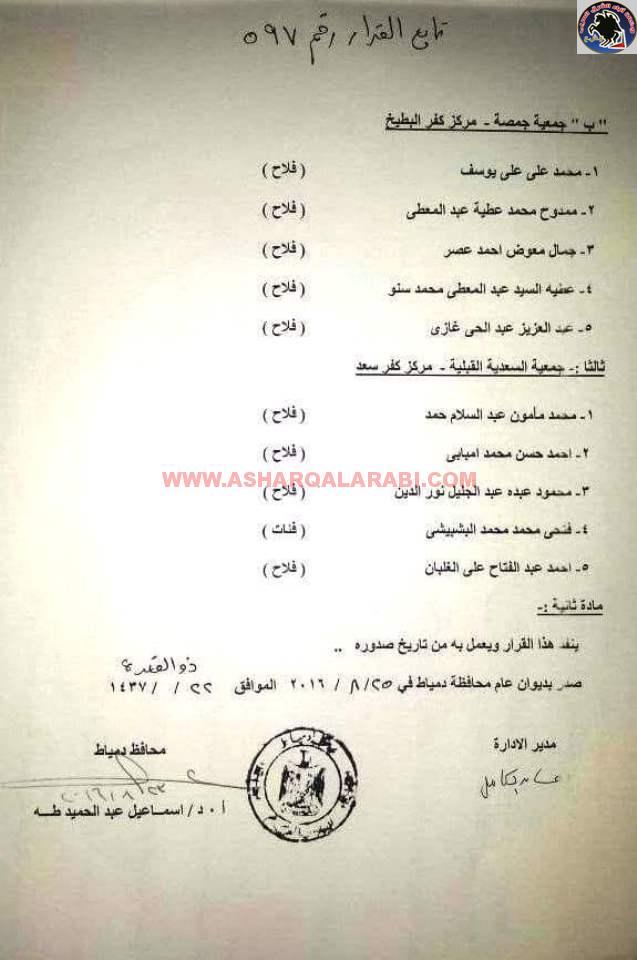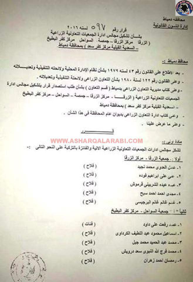 و.ش.ع كتب: رضا الحصري قرر محافظ دمياط تشكيل مجلس ادارة الجمعيات التعاونية الزراعية ( الزرقا- جمصة – السواحل – السعدية القبلية )… ويوحه بتنفيذ القرار من تاريخ صدوره.