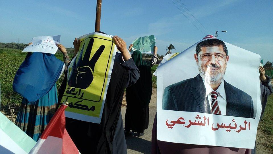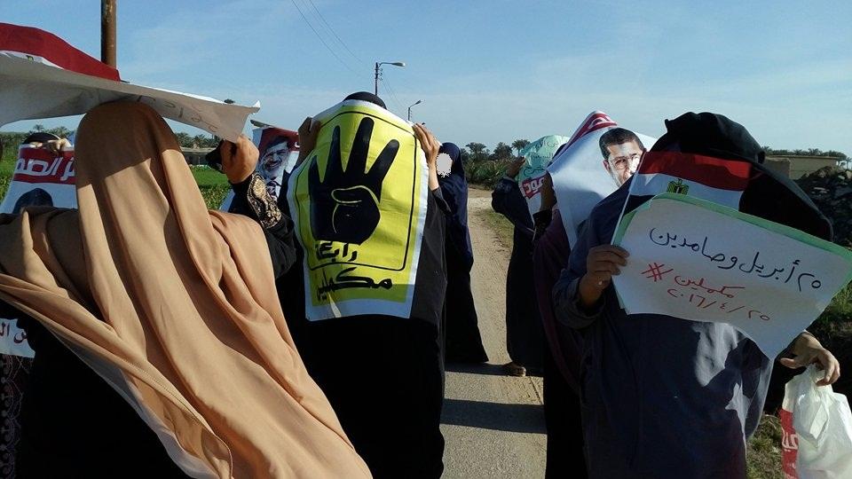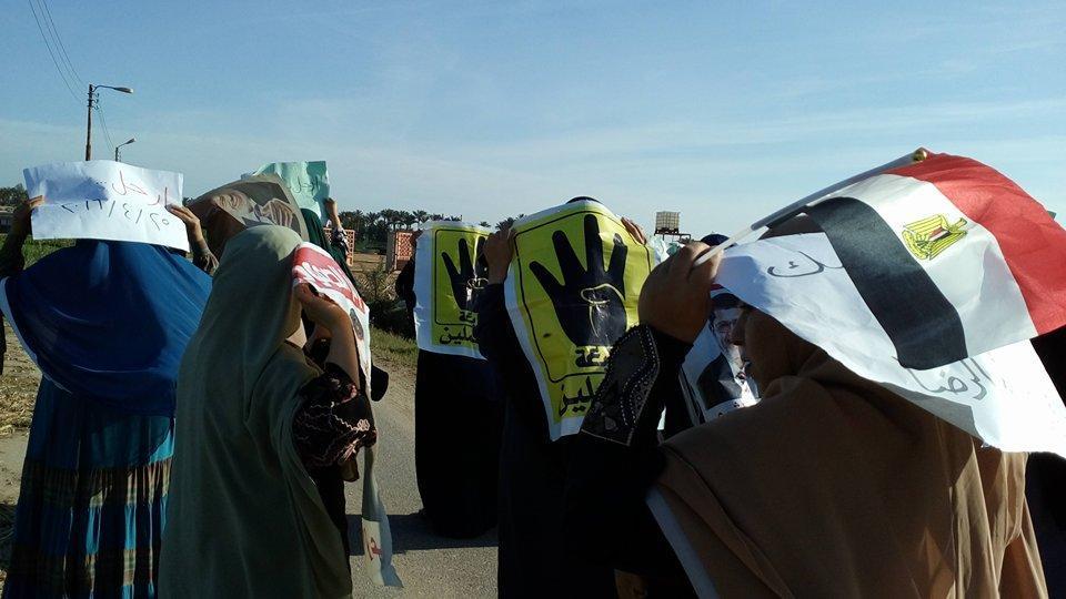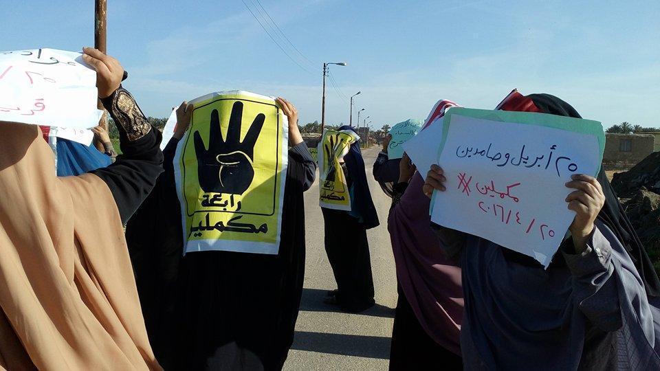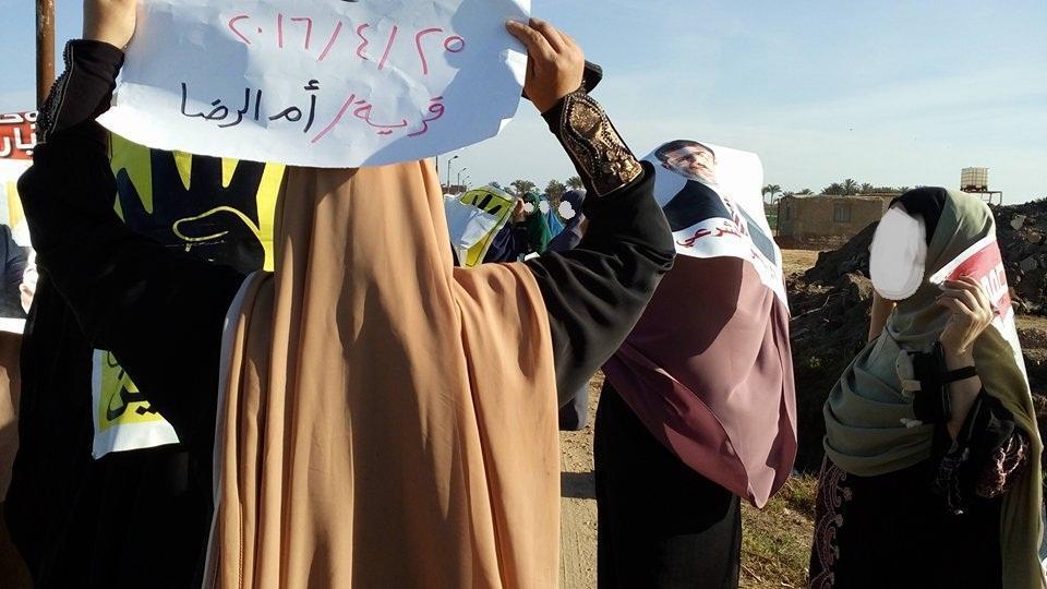 نظمت حرائر قرية أم الرضا عصر يوم 25 ابريل مسيرة نسائية في مدخل القرية حملت الحرائر صور الرئيس محمد مرسي و اعلام رابعة و لافتات تطالب برحيل السفاح الذي فرط في أرض سيناء