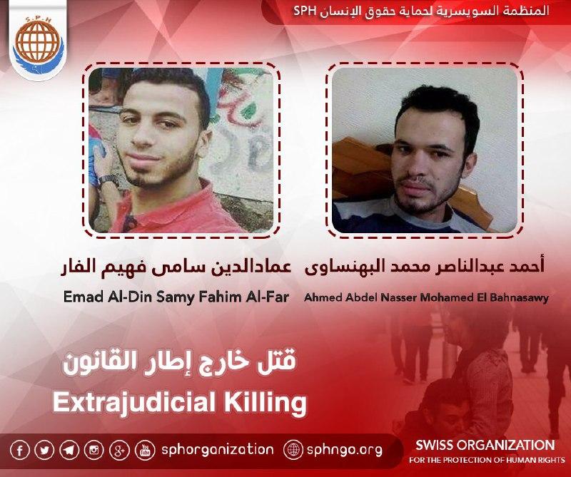 ورد للمنظمة، قتل 2 من المواطنين المصريين خارج إطار القانون، على يد قوات الأمن المصرية، وهم:1. أحمد عبدالناصر عبدالله محمد البهنساوى، 24 عامًا، طالب، يقيم قرية الأسدية – مركز أبوحماد – محافظة الشرقية.