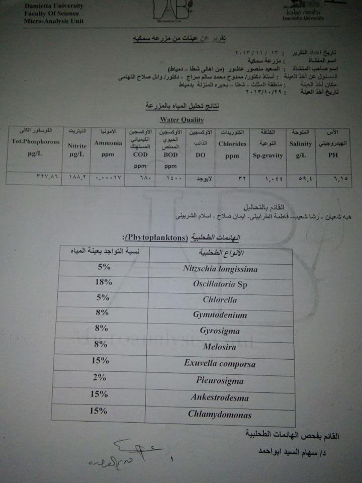 ورغم شكوى أصحاب المزارع من التلوث الذي أدى لخسائر فادحة، تقدر بملايين الجنيهات، إلا أن المسؤولين محلك سر، واكتفى بعضهم بنفي المشكلة من الأساس، كما حصلت “البديل” مستند لنتائج تحاليل عدد من المزارع السمكية، يؤكد وجود تلوث في المياه المغذية لأسماك المزارع، ما يتسبب بشكل مباشر في نفوقها.