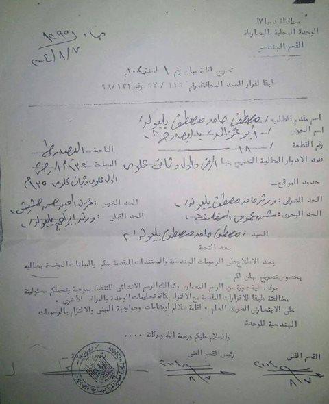 ورد للمنظمة وثيقة “تصريح مباني” الخاص بمنزل المواطن المصري/ مصطفى بلبوله، أمين مساعد الحرية والعدالة بدمياط، والذي هدمته قوات الأمن المصرية في 10 مايو/آيار الجاري بحجة أن المنزل تم بنائه بدون تصريح بقرية البصارطة، هذا الانتهاك الذي وثقته المنظمة في حينه.