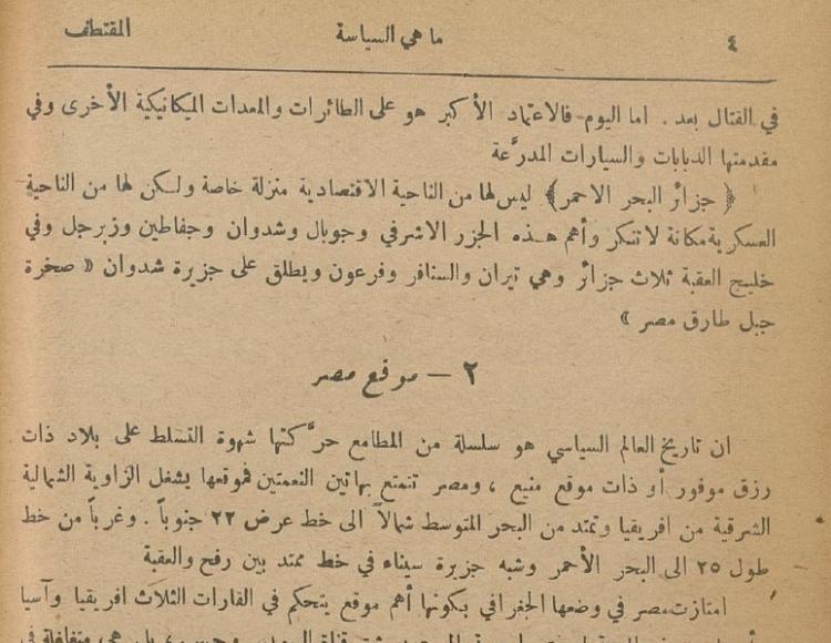 وكتب الصاغ عبد الرحمن زكي، في المقتطف عام 1941، تحت عنوان الجيش السليم في الأمة السليمة، أن جزر تيران وصنافير وغيرها من الجزر المرية لها أهمية اقتصادية لا تنكر”، وشرح الصاغ أهمية الموقع الجغرافي لمصر في صد الغزاة والمحتلين.