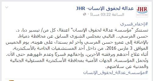 تستنكر “مؤسسة عدالة لحقوق الإنسان” اعتقال كل من/ تيسير دبا، د. حسن المرسي.. النائبي بمجلس الشورى السابق عن محافظة دمياط، بالإضافة إلى عمرو حسن المرسي وآخر لم يستدل على هويته، يوم الخميس الموافق 3 مارس 2016، من داخل أحد المستشفيات الخاصة بالأسكندرية، أثناء علاج أحدهم وبرفقته الآخرين، وإخفائهم قسريًا وعدم ظهورهم حتى الآن.