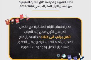 حرصاً من وزارة التربية والتعليم والتعليم الفني على مصلحة الطلاب بجميع مراحل التعليم قبل الجامعى، أصدرت الوزارة كتاباً دورياً بشأن نظام التقييم والدراسة خلال الفترة المتبقية من الفصل الدراسى الأول للعام الدراسي ٢٠٢٠ – ٢٠٢١، ويتضمن ما يلي: ١- عدم احتساب الأيام المتبقية من الفصل الدراسى الأول ضمن أيام الغياب …