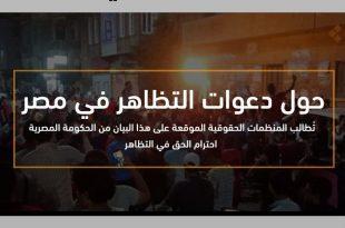 بيان رسميحول دعوات التظاهر في مصرتُطالب المنظمات الحقوقية الموقعة على هذا البيان من الحكومة المصرية، احترام الحق في التظاهر.ففي إطار متابعة المنظمات لدعوات التظاهر -السلمي- في العديد من الأماكن داخل مصر، رُصدت حالات اعتقال تعسفية لعددٍ من المواطنين –بينهم أطفال– تجاوز عددهم 400 حالة، تم عرض بعضهم على نيابة أمن …