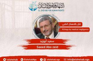 #قتل_بالإهمال_الطبي| وفاة الدكتور “سعيد أبوزيد” بمحبسه نتيجة الإهمال الطبي بعد معاناته مع السرطان #مصرورد إلى مركز الشهاب خبر وفاة الدكتور/ سعيد محمود مصطفى أبوزيد ، وذلك اليوم 30 يوليو 2020 بمعهد الكبد بشبين الكوم الذي نُقل إليه من محبسه بسجن وادي النطرون حيث كان يقضي حكمه.والدكتور المتوفى كان محكوما بالسجن …