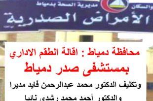 أكمل القراءة »#عاجل |محافظة دمياط : إقالة كلاً من مدير مستشفى صدر دمياط، ونائب ووكيل المستشفى نظرا لتقصيرهم وإهمالهم المتكرر