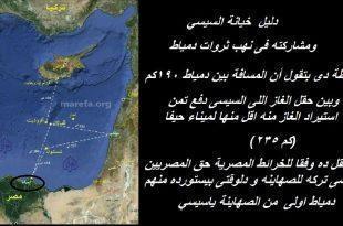 دليل خيانة السيسي للدمايطة ومشاركته فى نهب ثروات دمياط الخريطة دى بتقول أن المسافة بين دمياط (١٩٠كم) وبين حقل الغاز اللى السيسى دفع تمن استيراد الغاز منه اقل منها لميناء حيفا(٢٣٥ كم).الحقل ده وفقا للخرائط المصرية حق المصريين.السيسى تركه للصهاينه و دلوقتى بيستورده منهم .
