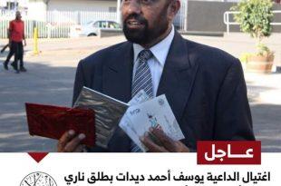 برصاص مجهول في جنوب أفريقيا..رسميا.. عائلة الداعية «أحمد ديدات» تعلن وفاة نجلها الأكبر «يوسف أحمد ديدات» ظهر الجمعة، متأثرا برصاصة مجهولة في عملية اغتيال تعرض لها صباح الأربعاء