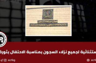 #نافذة_دمياط | زيارة استثنائية لجميع نزلاء السجون بمناسبة الاحتفال بـ23 يوليو أعلنت داخلية الانقلاب ، اليوم الخميس 19 يوليو، عن زيارة استثنائية لجميع نزلاء السجون بمناسبة الاحتفال بذكرى 23 يوليو . وقرر وزير داخلية السيسي منح جميع نزلاء السجون والليمانات زيارة استثنائية واحدة، اعتبارًا من يوم الثلاثاء المقبل 24 يوليو …