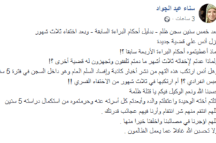 انتقدت سناء عبد الجواد، زوجة الدكتور محمد البلتاجي، عضو برلمان الثورة، تلفيق سلطات الانقلاب قضية جديدة لنجلها “أنس” بعدد إخفائها قسريا لعدة أشهر عقب حصوله علي براءة من اتهامات سابقة. وكتبت عبد الجواد، عبر حسابه علي فيسبوك، “بعد خمس سنين سجن ظلم – بدليل أحكام البراءة السابقة – وبعد اختفاء …