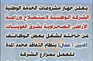 يعلن جهاز مشروعات الخدمة الوطنية للقوات المسلحة “الشركة الوطنية لاستصلاح وزراعة الأراضي الصحراوية بشرق العوينات”، عن حاجته لشغل بعض الوظائف من الشباب “عمال وفنيين”، للعمل بمزارع الشركة بشرق العوينات وتوشكي والفرافرة بنظام التعاقد محدد المدة. واشترطت الشركة أن يكون المتقدم للوظيفة من الذكور نظرًا لطبيعة موقع العمل والبعد عن المناطق …