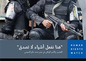 مصر: وباء التعذيب قد يشكل جريمة ضد الإنسانية المعارضون يخضعون روتينيا للضرب، الصعق بالكهرباء، والتعليق (بيروت) – قالت “هيومن رايتس ووتش” في تقرير صدر اليوم إن ضباط وعناصر الشرطة و”قطاع الأمن الوطني” في مصر، في عهد الرئيس عبد الفتاح السيسي، يعذبون المعتقلين السياسيين بشكل روتيني بأساليب تشمل الضرب، الصعق بالكهرباء، وضعيات …