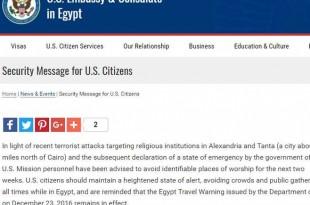 دعت السفارة الأمريكية بالقاهرة البعثة الدبلوماسية والأمريكيين في مصر إلى الحذر أثناء بقائهم هناك خلال الأسابيع المقبلة عقب التفجيرات الإرهابية الأخيرة وإعلان حالة الطوارئ. وقالت السفارة (الثلاثاء) في منشور على موقعها الرسمي على الإنترنت: “في ضوء الهجمات الإرهابية الأخيرة التي استهدفت مؤسسات دينية في الإسكندرية وطنطا وإعلان الحكومة المصرية حالة …