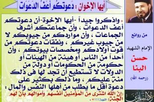 يقول الامام الشهيد حسن البنا رحمه الله تضـحية واذكروا جيداً أيها الإخوة أن دعوتكم أعف الدعوات ، وأن جماعتكم أشرف الجماعات ، وأن مواردكم من جيوبكم لا من جيوب غيركم ، ونفقات دعوتكم من قوت أولادكم ومخصصات بيوتكم وأن أحداً من الناس أو هيئة من الهيئات أو حكومة من الحكومات …